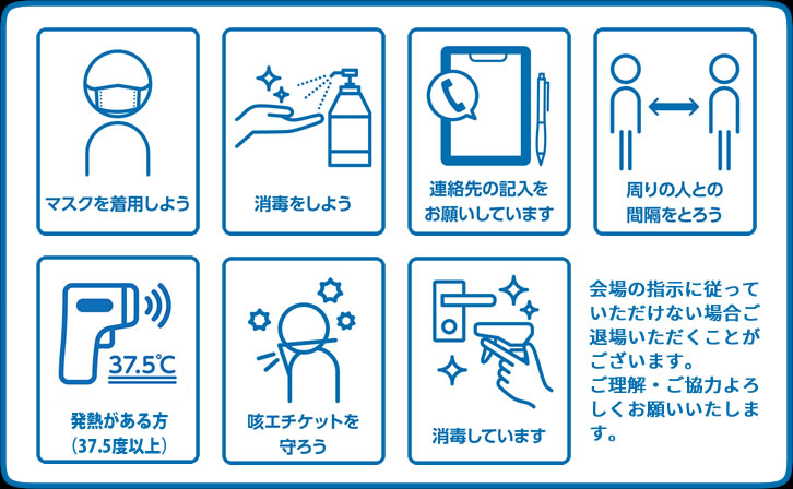 - 入口、場内に消毒液を設置しております。来場時や休憩中など手指のこまめな消毒をお願い致します。